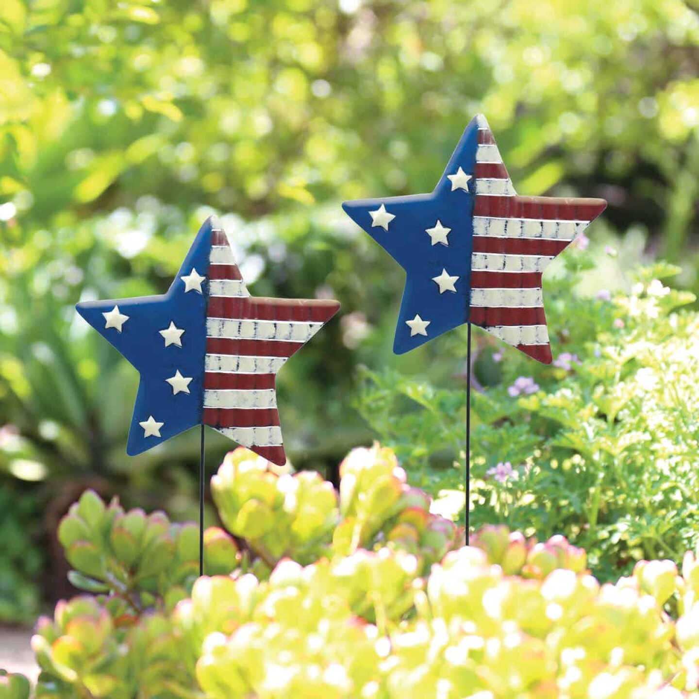 Patriotic metal flag star-shaped garden stake. Ideal for adding a patriotic look to any lawn or landscaping.