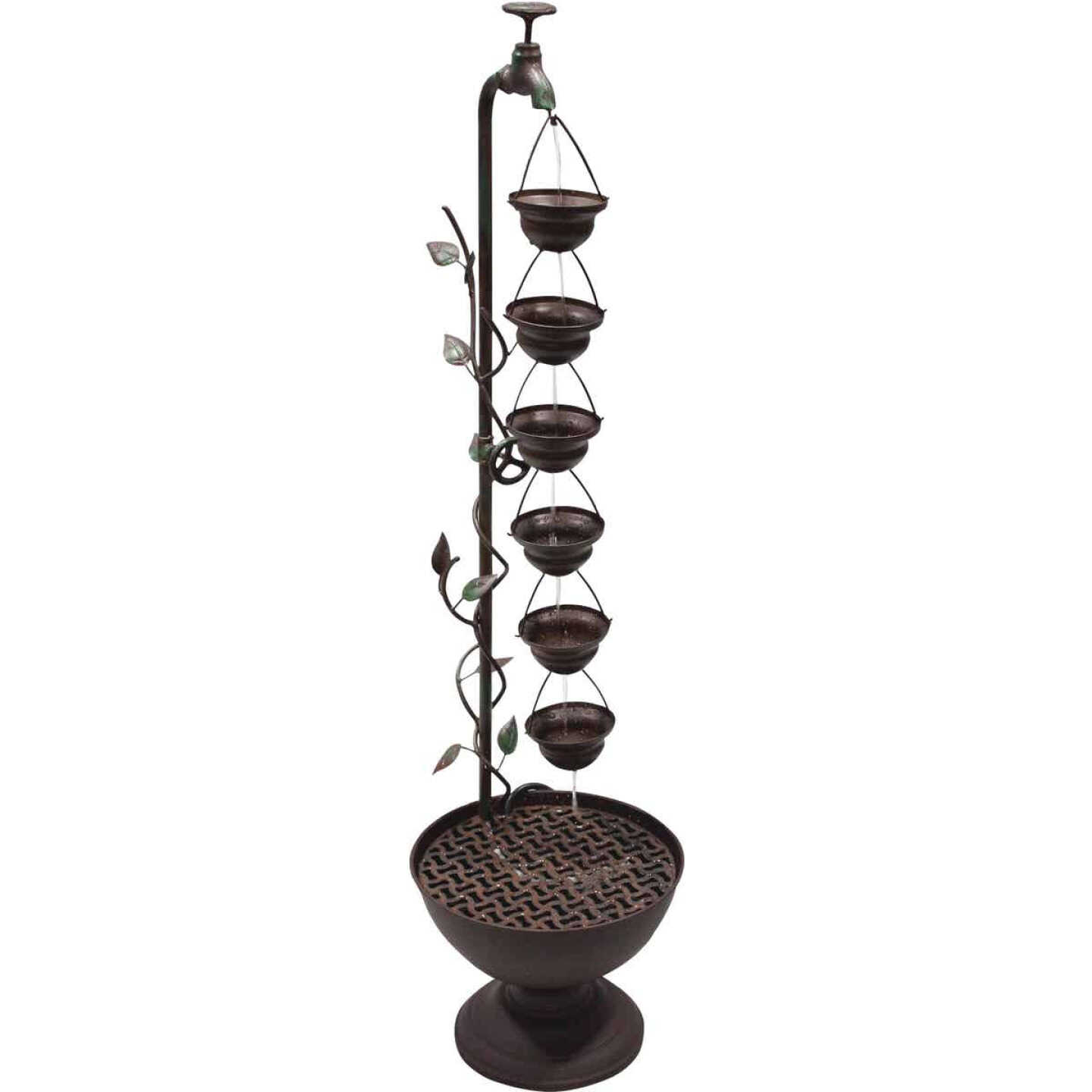 Rustic style 6 hanging cup tiered fountain. Ideal for indoor or outdoor use. Durably constructed featuring an ultra violet protection finish. Includes 2-liter water capacity pump with 6-foot power cord.